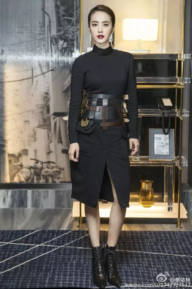 蔡依林身穿及膝裙也是用了腰封的套路来提高腰线拔高身高。