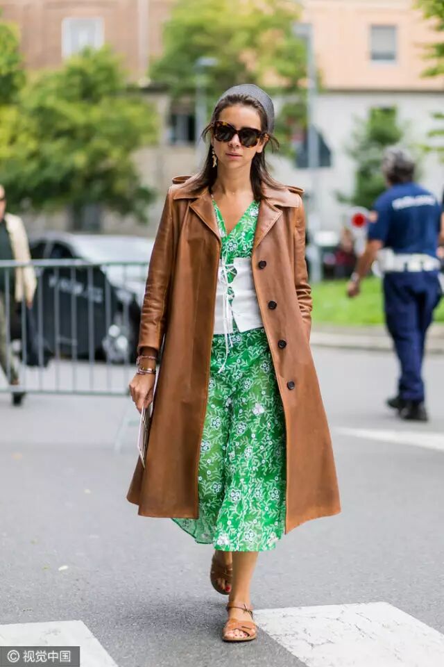 今年还很hit宽边的腰封,小个子博主Natasha Goldenberg穿大衣内搭的绿色印花长裙,有绑上一条白色腰封突出小蛮腰。