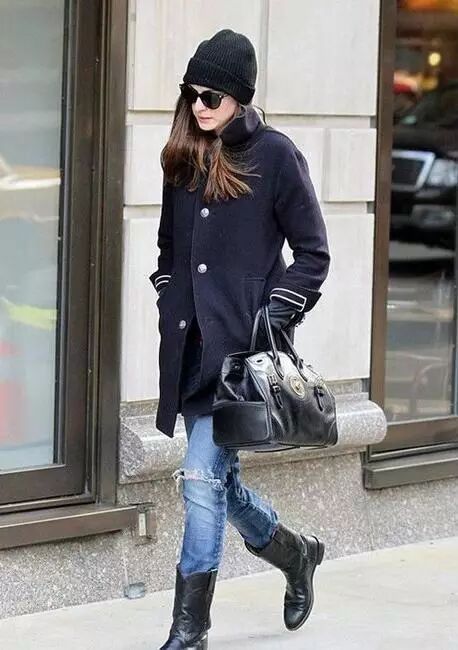 毛线衣搭配呢子大衣,加上一双中筒骑士靴,大冬天的帽子也是必备的呢,这么酷帅的装扮,哪个女热不心动呢,不过下身的破洞牛仔裤就要舍弃了呢,即使是冬天国内南方这样的气温,里面没件秋裤,绝对会全身都冻呢。