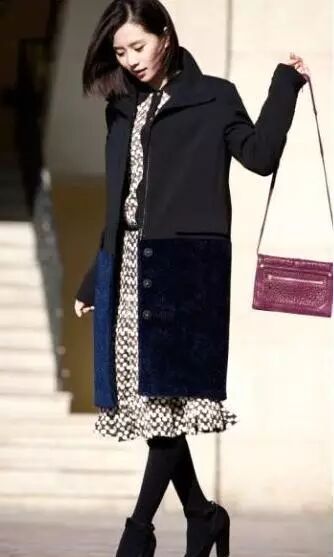 看刘诗诗(诗爷)的这套装扮就非常适合冬天穿了,印花的衬衫连衣裙搭配长款拼接呢子大衣,黑色打底裤几乎是女人冬季衣橱的必备品,一双黑色靴子也是增添女人味气质的百搭单品哦,如果觉得冬天这样的装扮不够出彩,那么一个带有亮色的包包会是必要的配饰装扮了。