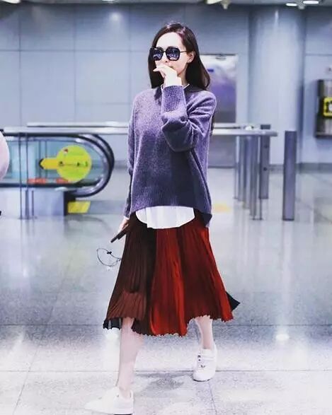 唐嫣近期的机场搭配层次感有,颜色配搭也是十分出彩的,前短后长的毛线衣搭配白衬衫露出下摆,下身今年非常流行的百褶裙,深红的酒红色与紫色形成了对比,撞色的方式很讨巧呢,一双小白鞋让装扮休闲,整个装扮很率性,不过露出一截小腿,简直有种‘美丽冻人’的感觉呀。