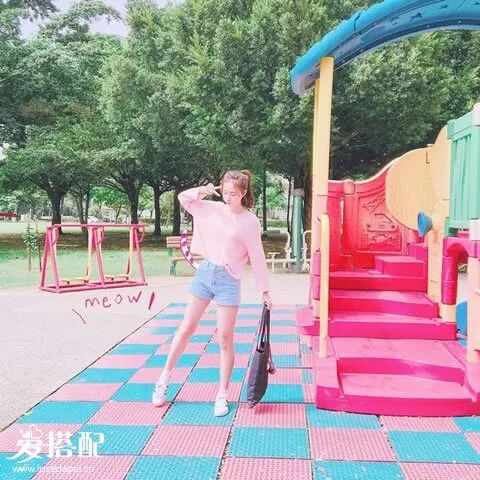 小白鞋搭配牛仔短裤,上穿一件粉色宽松T恤,上松下紧的穿搭特别时尚。▼