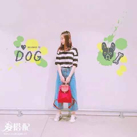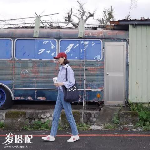 如果想穿的更有内容一些,选择红色条纹的小白鞋,用同色系的帽子来呼应色彩,整体的“蓝+红”特别的时髦。▼