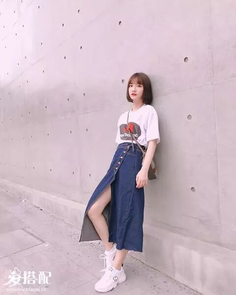想更加女人一些,用白色运动鞋搭配这样的中款牛仔裙,前开叉的设计更有女人味。▼