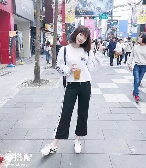 校服裤持续流行,小白鞋搭配九分校服裤和白色卫衣,很有韩范的小清新有木有?▼