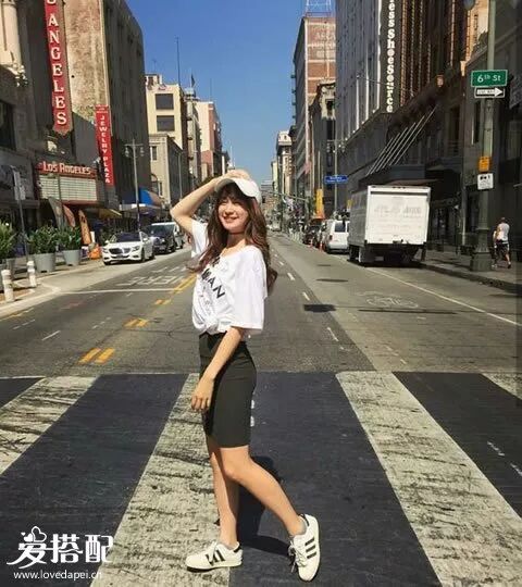 黑白配是永恒的时尚,白色字母T恤搭配黑色一步裙,白色sneakers运动鞋负责舒适和时尚。▼