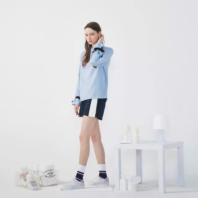 看起来很乖巧的蓝色上装,仅在袖口处加入绑带细节就拔高了时髦度。跟带有条纹运动元素的短裤配在一起,不会淑女的太甜腻,反而有种潇洒。