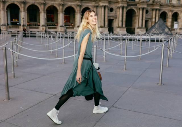 裙装混搭运动鞋早已不是什么新鲜事,短裙+Sneaker的穿法几乎人人都会,这一季不如尝试用材质轻薄的长裙混搭运动鞋。 材质和风格的冲突感 ,看起来反而更有新意。
