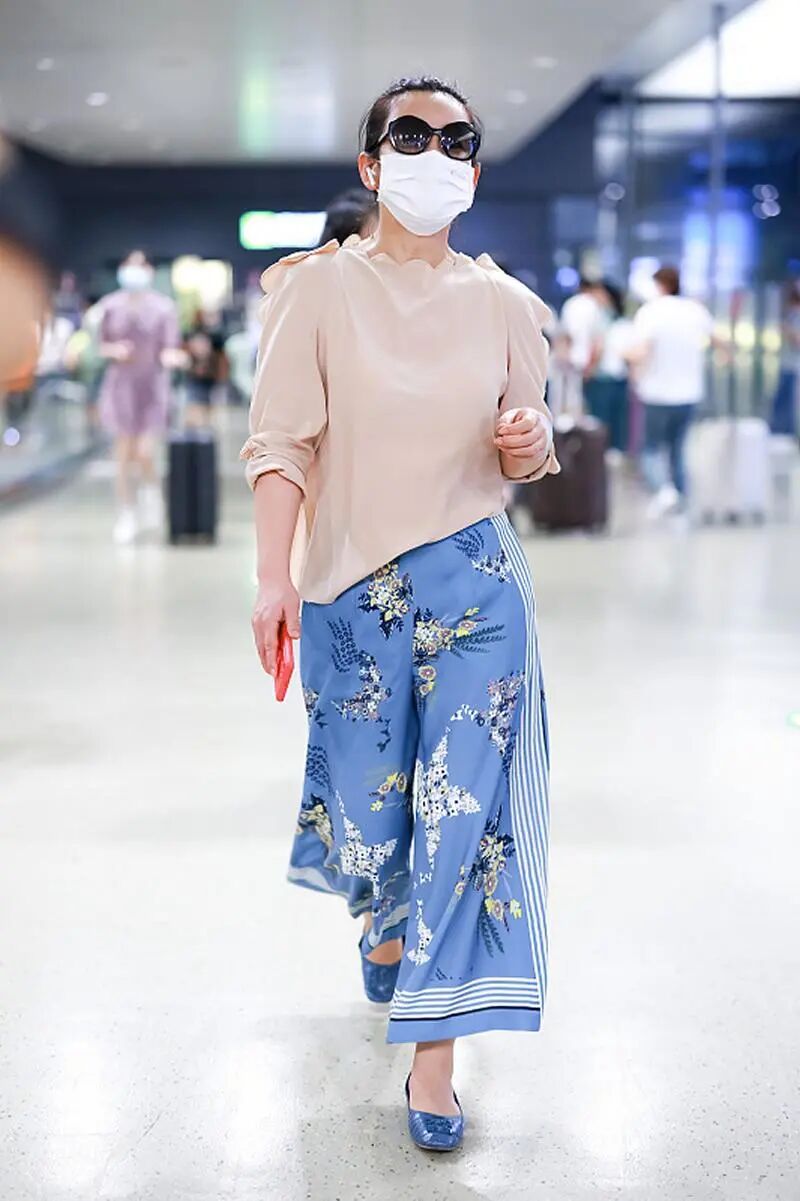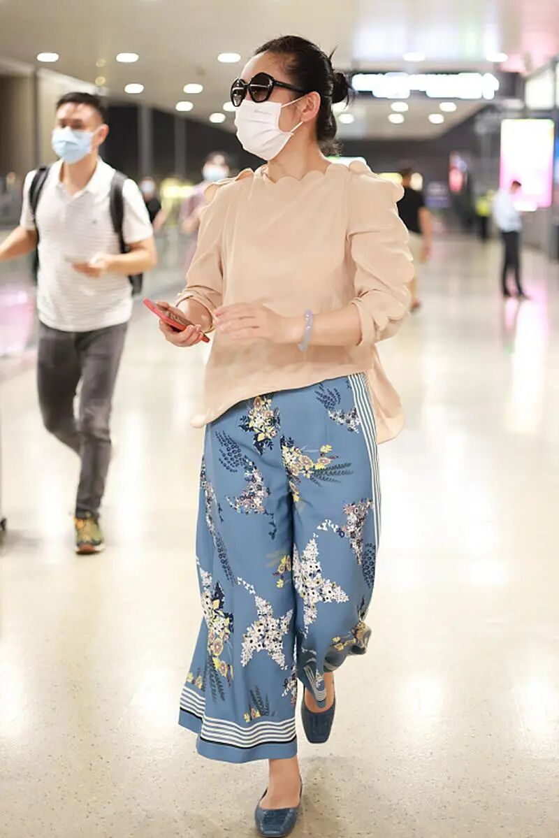 中年女人要穿颜色清爽又有质感的印花阔腿裤。所以这颜色一定要少。花裤子里的颜色最好不要超过三种。像上图秦海璐穿的这件以蓝色为主色,黄色和白色作为辅助色的印花阔腿裤就不错。
