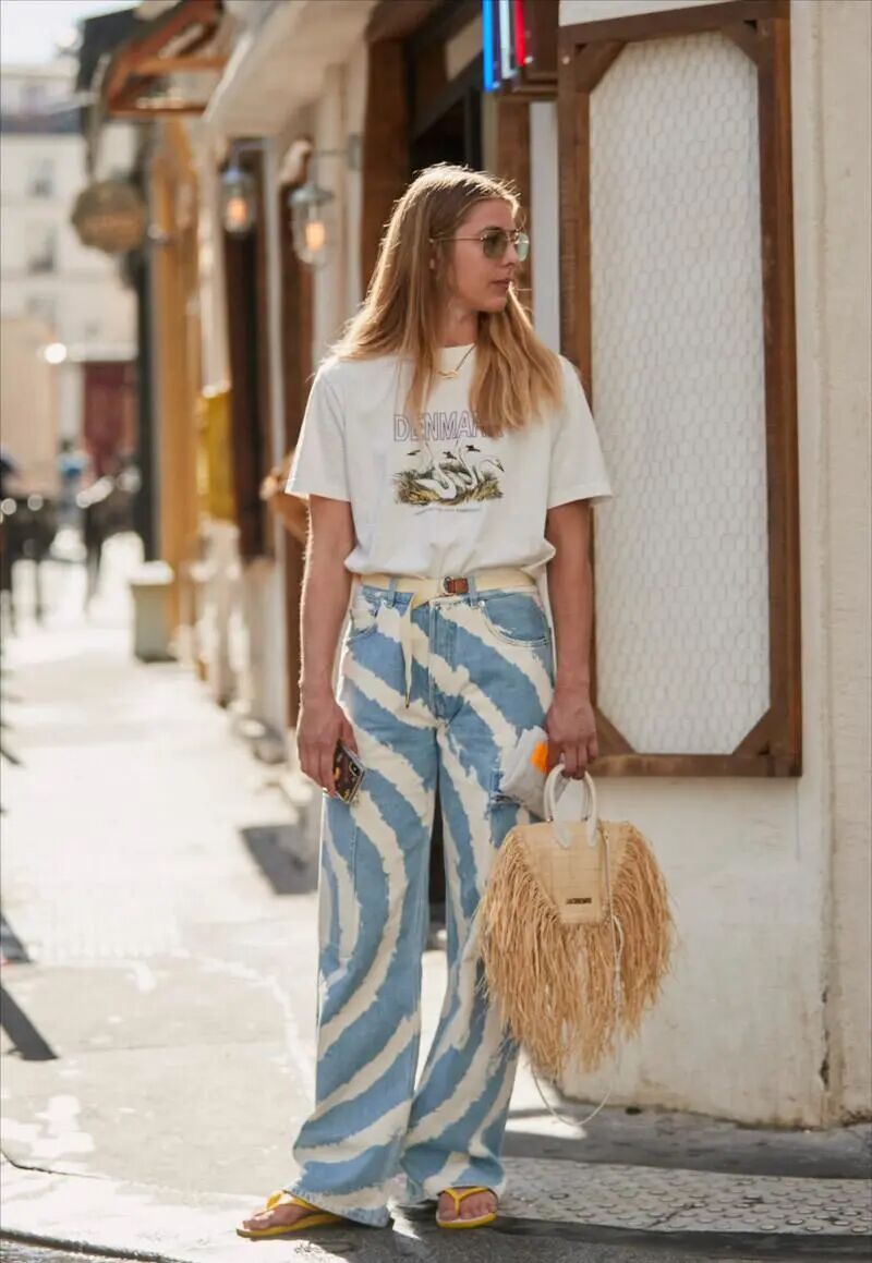 如果T恤胸前的图案太多,颜色太多,再加上印花阔腿裤的颜色,那全身的颜色就有点多了。那样比较俗气。上图这姑娘穿的这件T恤的图案就稍稍有点大。好在她的花裤子是蓝白色的。还算清爽。