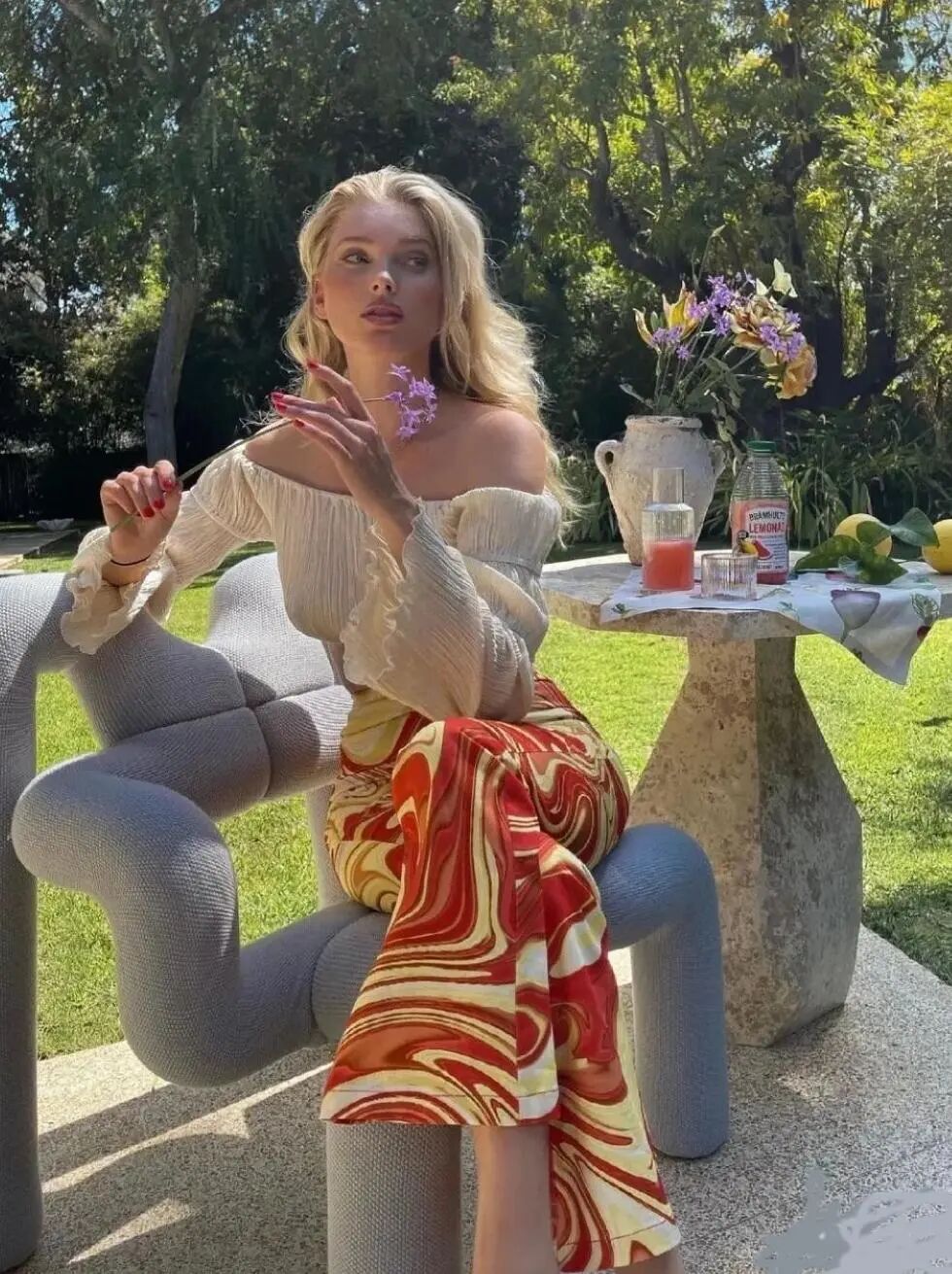 说完了印花阔腿裤的配色。我们再来看看印花阔腿裤的版型。这两年很流行宽松的裤子。所以这花裤子的裤腿越宽大,就越时髦。不容易穿的土气。选印花阔腿裤一定要不能选锥形裤或没型的直筒裤,那样真就成了老奶奶们穿的裤子了。