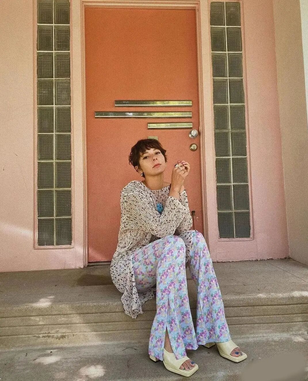 上图前海路就配得不错。她给这件蓝色印花的A字型九分阔腿裤配了件米色的花瓣领子的长袖衬衫。这个颜色非常有高级感。再花哨的花裤子,有了这件上衣的加持,就会变得非常有质感了。像米色,裸色,奶油色或杏色都是可以和印花阔腿裤搭配的。