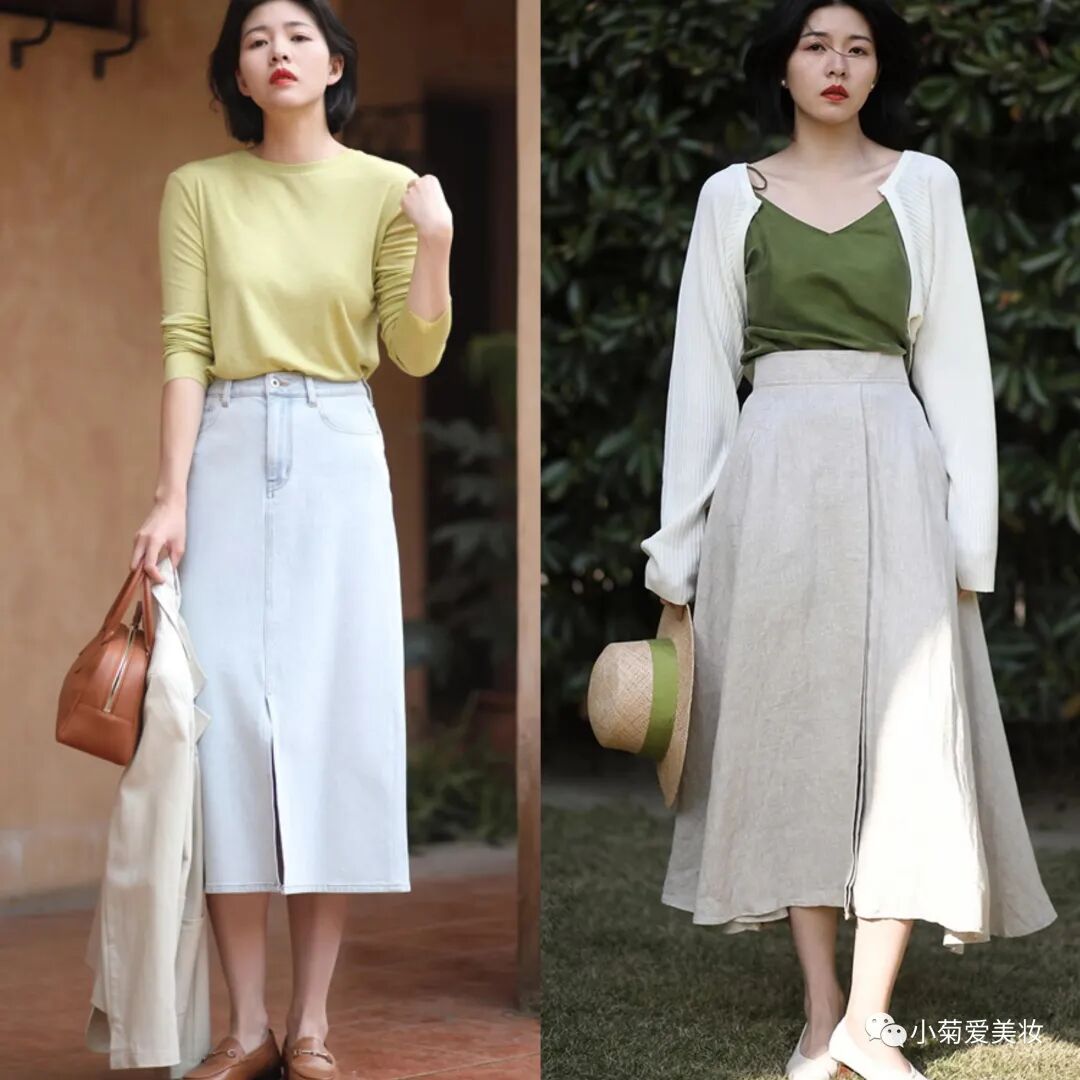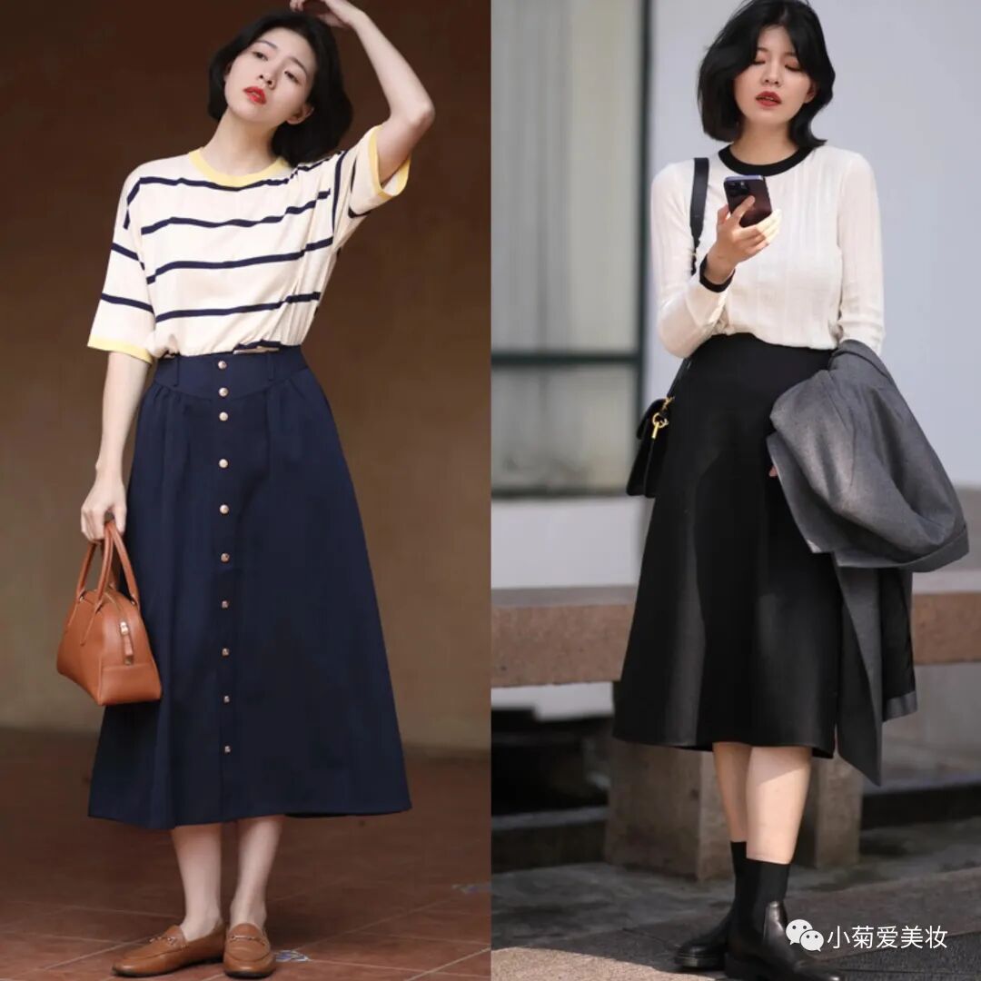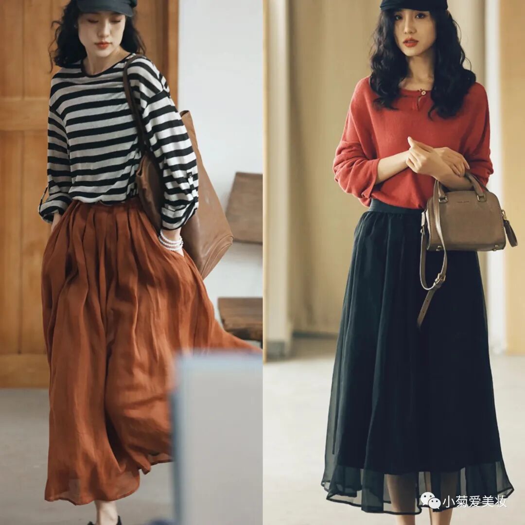 苎麻的半身裙自带文艺风,很适合走轻熟路线的70后小姐姐们,把条纹T恤穿到裙子里打造腰线,可以将上下很好地分割,显瘦显高又气质~