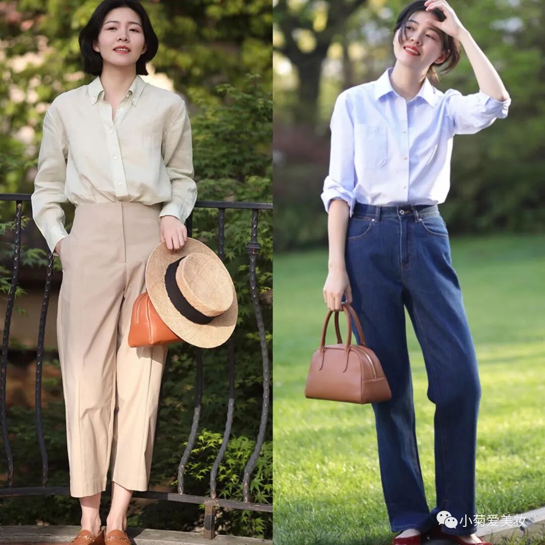 肚子上有点肉肉的女生,不建议选择超高腰的版型,不然穿上会特别显小肚子,中腰或者低腰的都行,然后选择宽松的衬衫,将衬衫塞到裤腰里,刚好将小肚子遮挡起来,不会显胖又有气质~