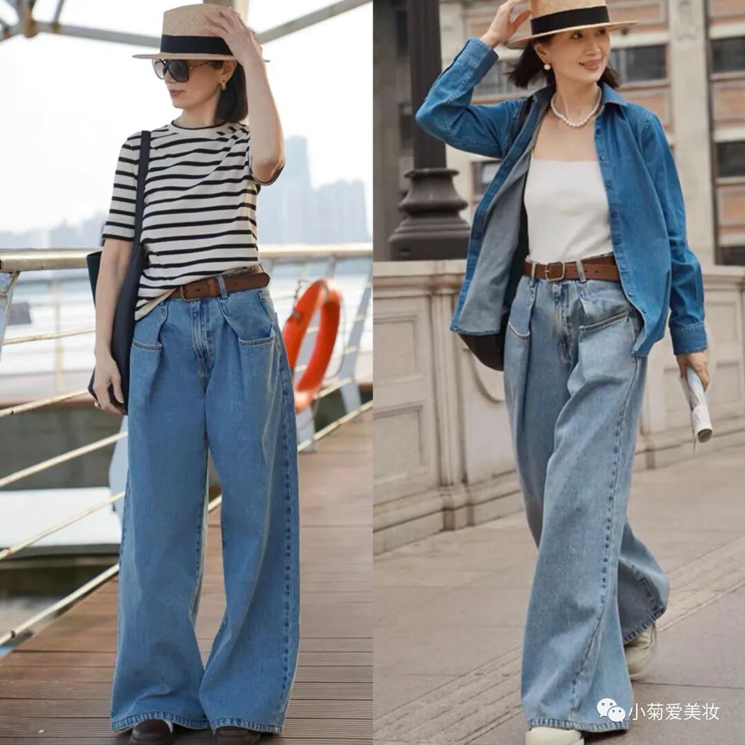 但我们普通人身材可能保持得不会那么好,所以要学会扬长避短,挑选上衣时不要紧身的,带点轮廓的能修饰身材,阔腿裤腰部也不用太高,然后跟上面一样将衣角放进裤腰里,还挺时髦的呢~