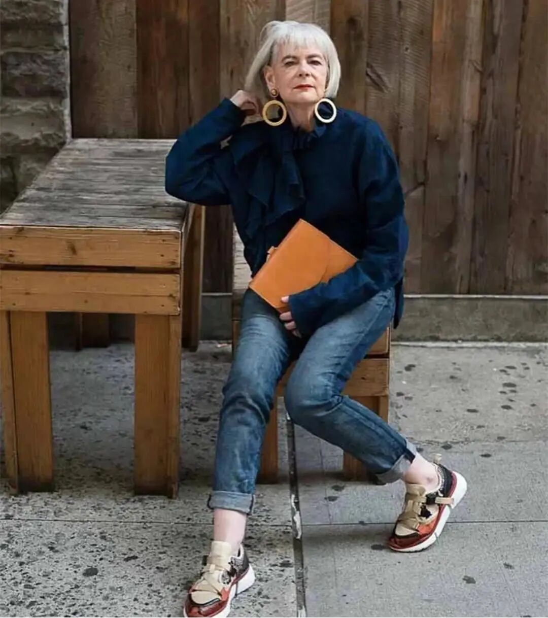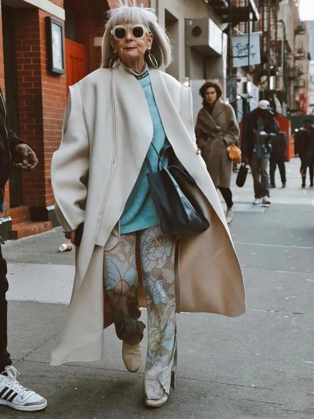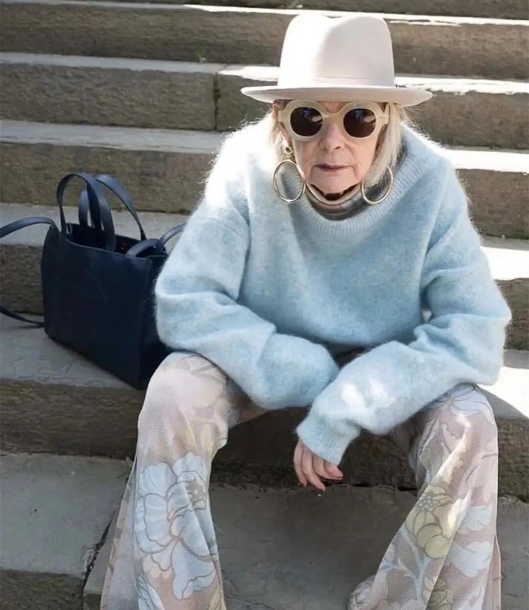 70岁的Lyn Slater格外喜欢超大的墨镜和夸张的大耳环,她有80%的造型是佩戴着这两件首饰,轻松聚焦观赏者的视线,也丰富了整套造型的精致度。