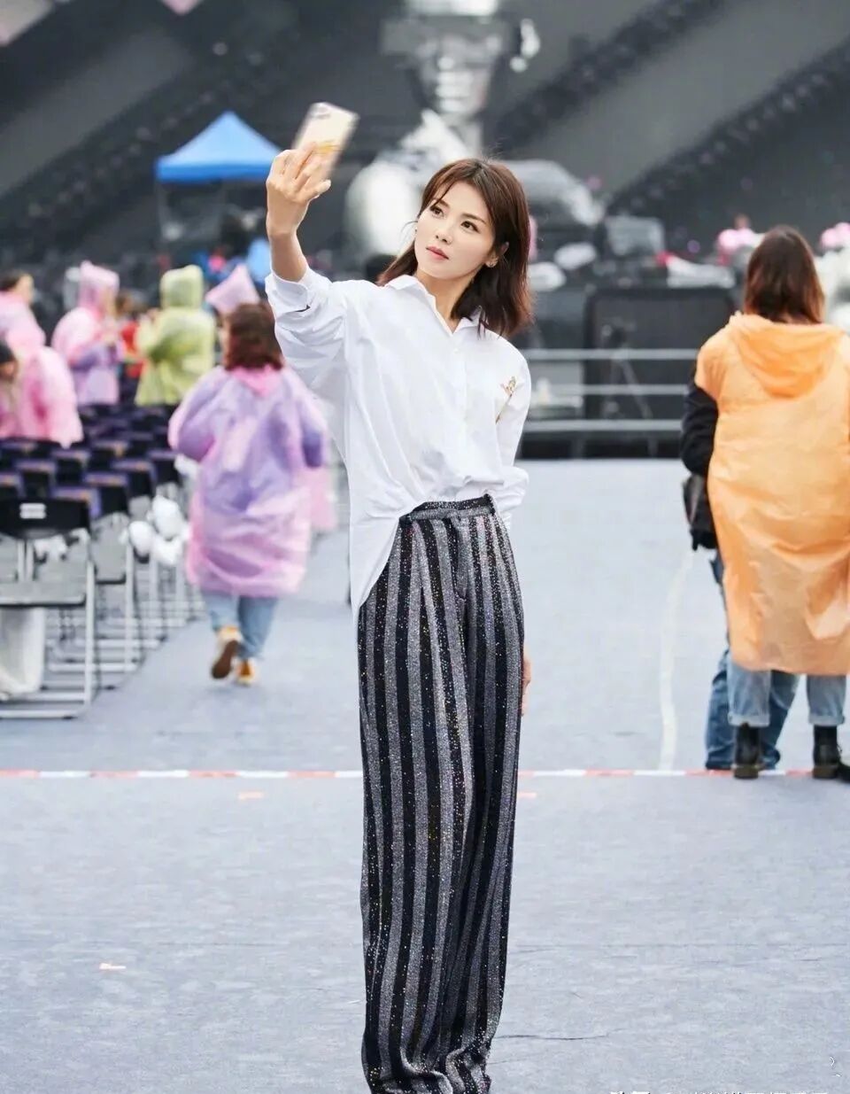 当然如果你还是很爱亮眼的设计,比如这件亮片阔腿裤,这时候你就要选择像白衬衫这样浅色去提亮它,同时也压制它的浮躁感。