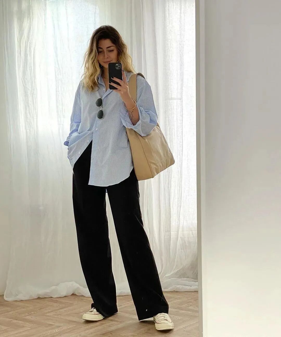 像这样一件浅蓝色的衬衫搭配黑色的直筒裤和小板鞋,日常休闲又装嫩不尴尬。