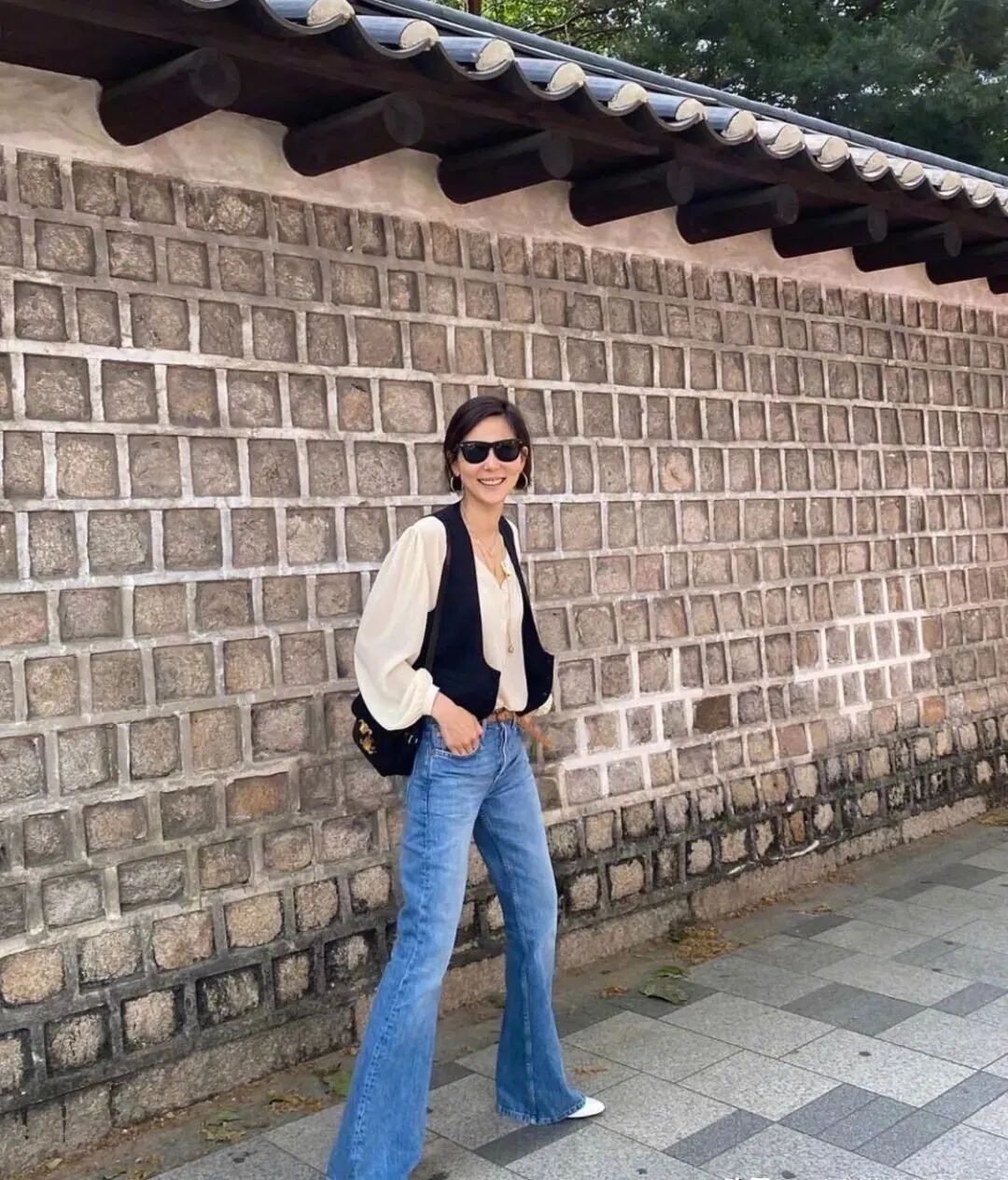 谁说40+的女性就不能追求时尚,想把衬衫穿出时尚感,叠穿可以试一试!灯笼袖的鸡心领衬衫加上黑色的马甲,一件高腰的喇叭牛仔裤搭配白色的小皮鞋,变身肆意的西部女郎。