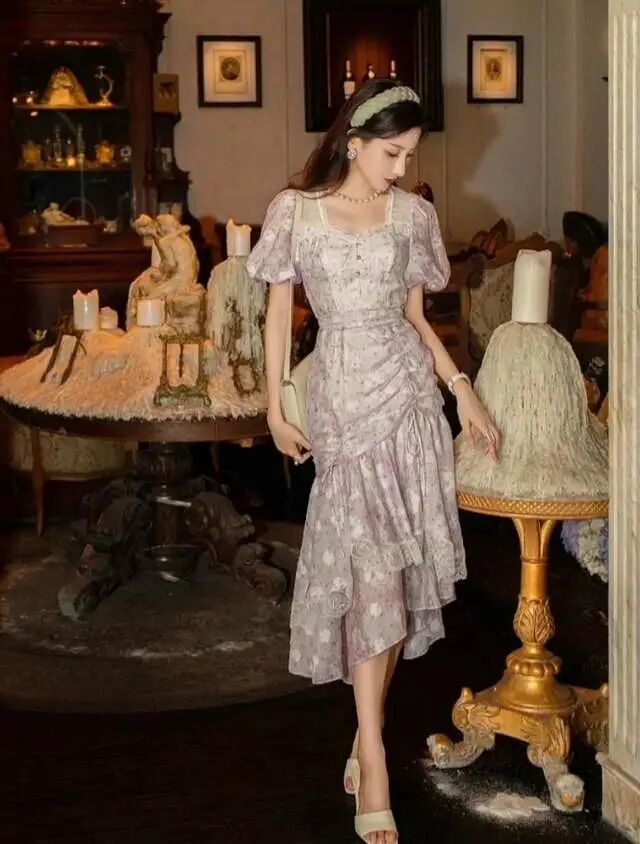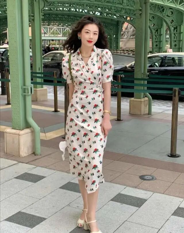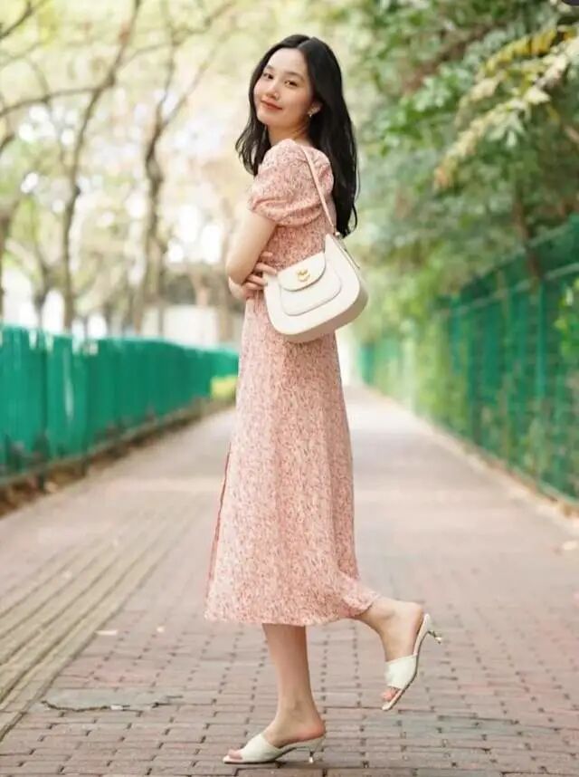 如果你的碎花裙是连衣裙的设计穿搭,想要穿出衬显高挑的效果,可以将你的高腰线位置水平提升,也就是搭配具有高处收腰设计的碎花裙,不仅能够体现纤细的腰身,同时缩短上身、拉长下身,更显高。