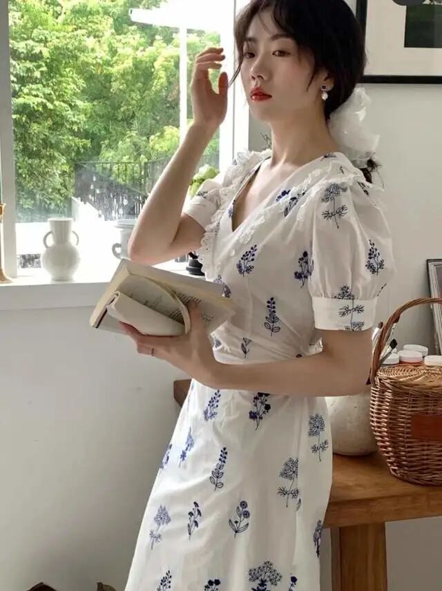 连体型的碎花裙搭配,建议大家要更注重上半身的细节性修饰,优先穿搭V领小方领这种具有拉伸能力的领口设计,让你的脖颈曲线更修长、锁骨以及胸前的肌肤更衬显美感,提升女性的小性感魅力。