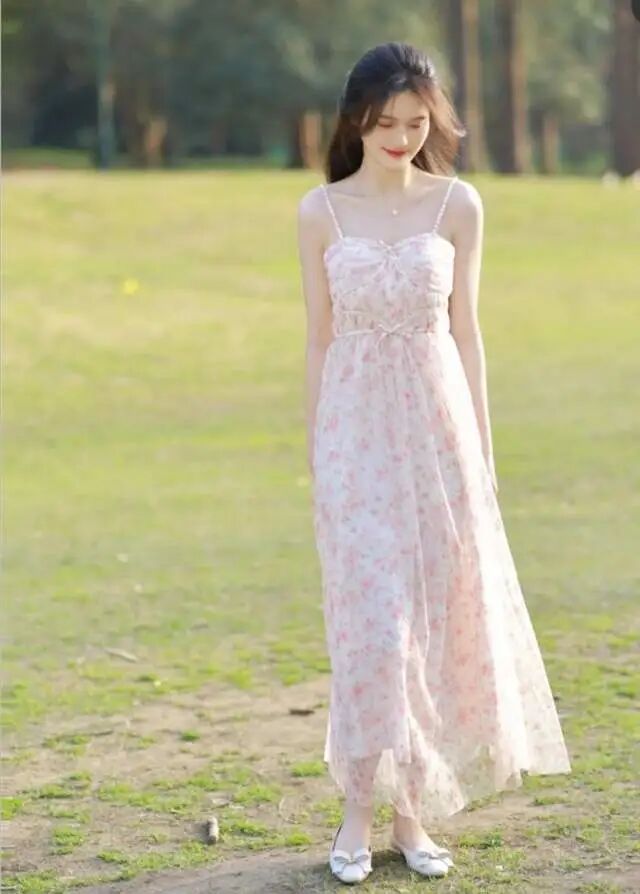 粉色调的碎花裙搭配,优雅、甜美又十分具有减龄可爱的小女生魅力,浅色调的底色在夏季之中,真的很适合。吊带的设计展露出来了“露肤性”的优势,这其中又完美衬托出来了一种神秘知性的感觉。