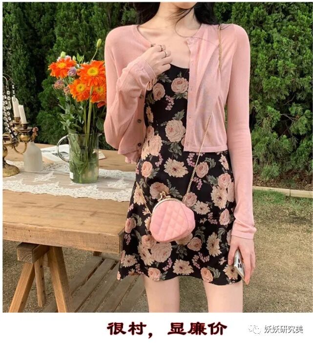 比如:深色系的碎花连衣裙,因为外搭了一款黄色马甲,有了小面积的视觉提亮,看起来就会更提亮肤色,显白一些。