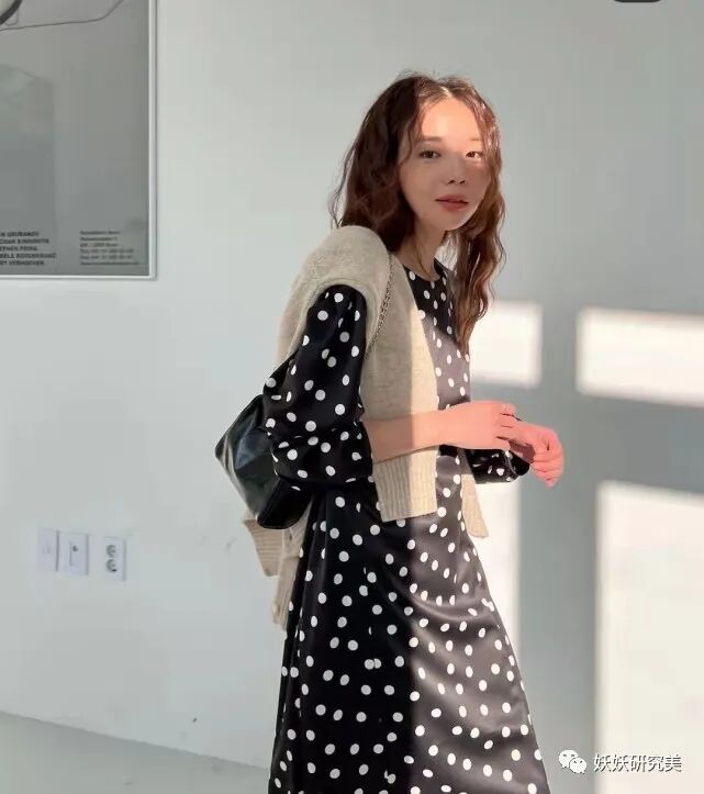 比如,大面积的印花裙装时,记得用一款纯色针织衫,外穿也好,披肩也罢,它都会削弱大面积印花带来的吸睛感。
