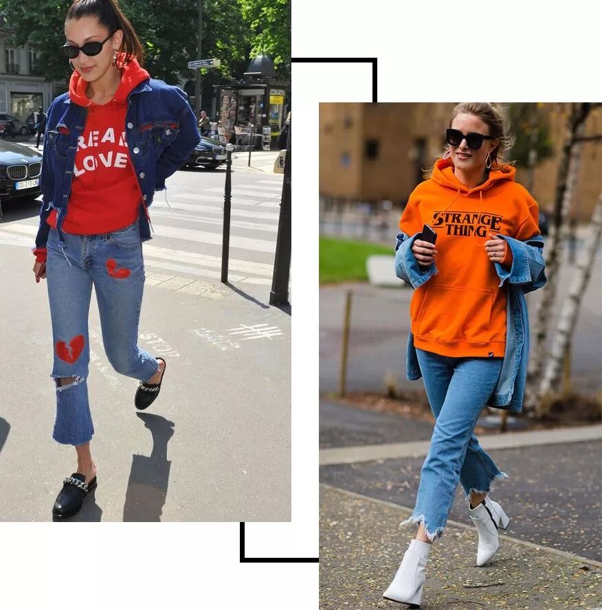 色彩鲜艳的卫衣,和牛仔外套一起碰撞出青春活力,超显年轻。