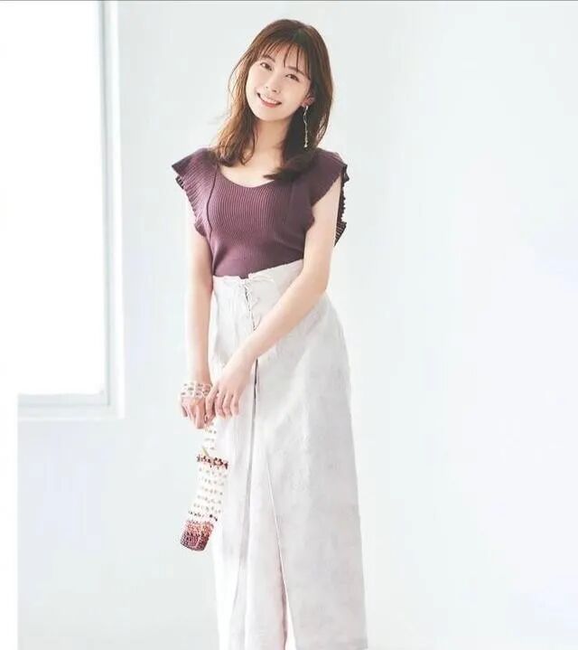 在挑选裙装的时候,可以着重半身的高腰裙,比如这种带有腰封设计的高腰,同时下半部分有微微的褶皱设计,在纯色的裙子上带有花纹的点缀,搭配紫色的无袖衫将两种颜色配合得很好,过膝长裙高腰设计,简单又大方,能够直接突出整体造型的大气简约感。