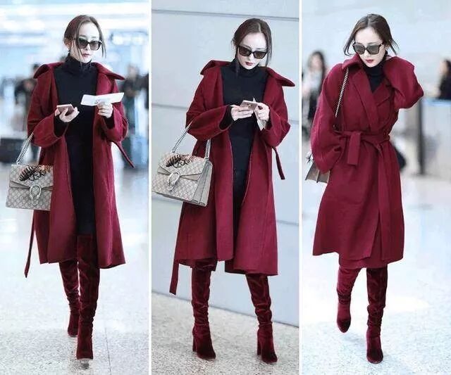 大幂幂这套让人过目难忘的酒红色秋冬穿搭,外套来自90%的人买不起的爱马仕,墨镜和包包来自Gucci,丝绒长靴是也不便宜的aquazzura: