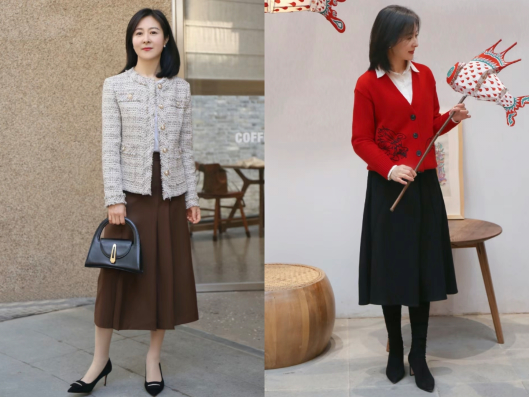 推荐穿搭3:半身裙+外套爱穿裙子的朋友看过来,你可以像上方图左那位女生一样,上半身穿一件浅灰色的小香风外套,搭配一条浅褐色的褶皱半身裙。一双黑色的高跟鞋让整套造型产生了微妙的气场变化,一个跟高跟鞋颜色相互呼应的手提包相得益彰。又或者你可以穿一件白色的内搭,穿一件红色的针织衫当外搭,一条黑色半身裙与长筒高跟鞋相互呼应,显腿长。图片来源小红书账号ID:Liyalu、492431587、104914925