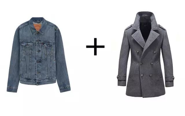 牛仔夹克与大衣的叠穿让人感觉很硬朗,最好搭配其他颜色的外衣,才会显得有层次感。