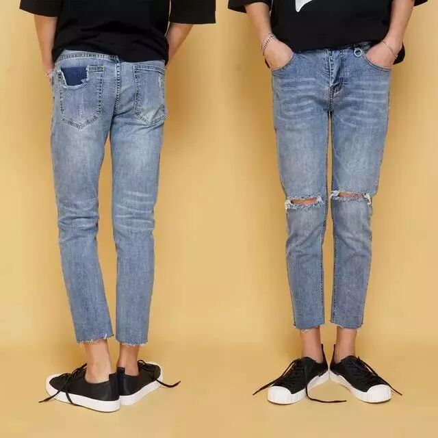 秋季潮男水洗破洞哈伦裤 浅色系小脚裤韩版修身9分牛仔裤