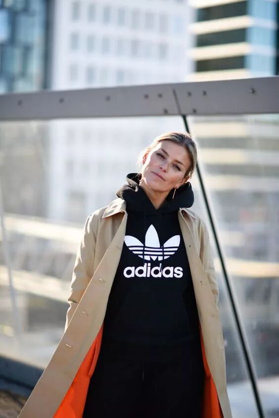 黑色系的卫衣能与小黑裤打造同色系搭配,