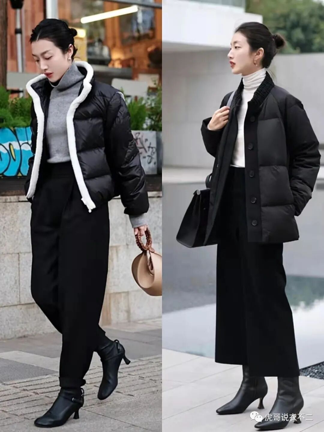小个子女生原本在身高上就不占优势,穿羽绒服时一定要避免全身颜色数量太多,像很多繁杂配色看起来丰富,实际上会导致着装中的分割线过多。三、“不露脚踝不露腿”的搭配示范