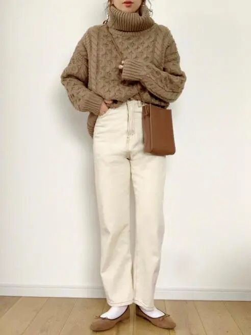 图中模特以黑色高领毛衣搭配白色宽松休闲裤,一身黑白配着装简单又经典,高级感满满。