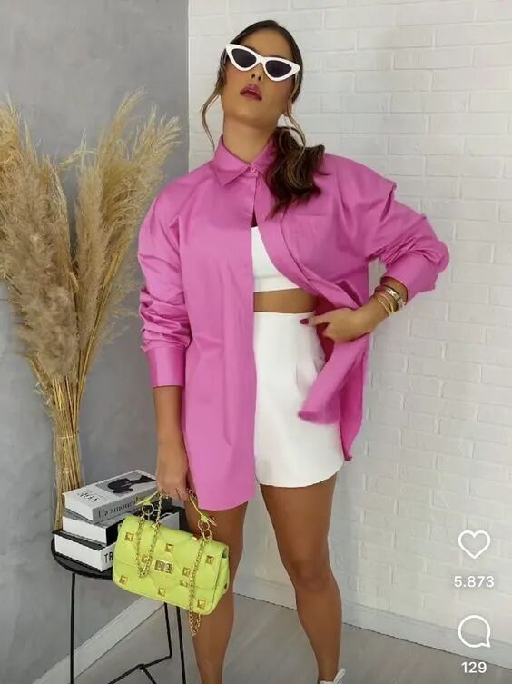 玫红色男朋友衬衫个性的颜色,款式的版型非常适合即将到来的夏日搭配一件白色高腰短裤展现出女性独有的洒脱个性,随性之外还不乏高级感。