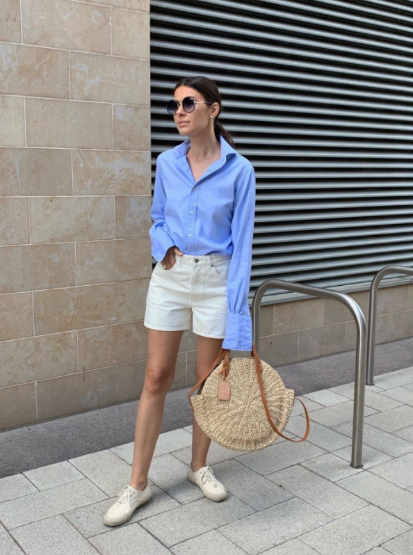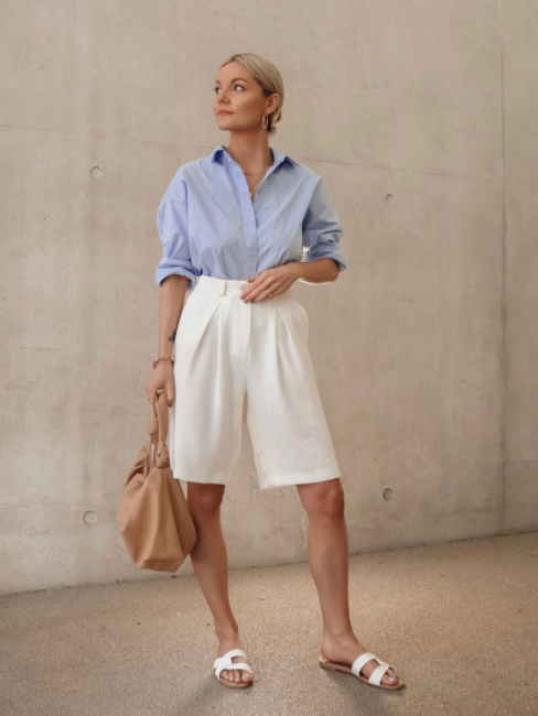 蓝色男朋友衬衫搭配白色高腰短裤,这样的穿搭显白显气色,让我们的穿搭都更加自信满满。