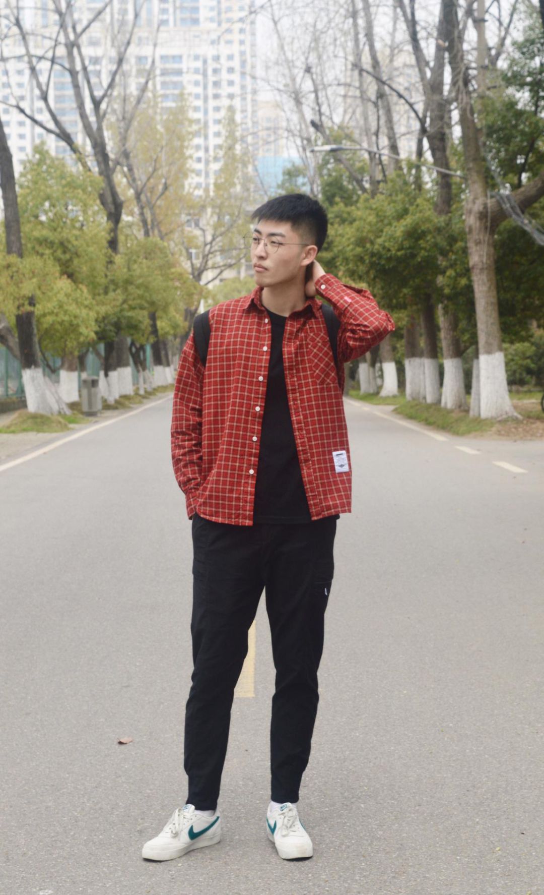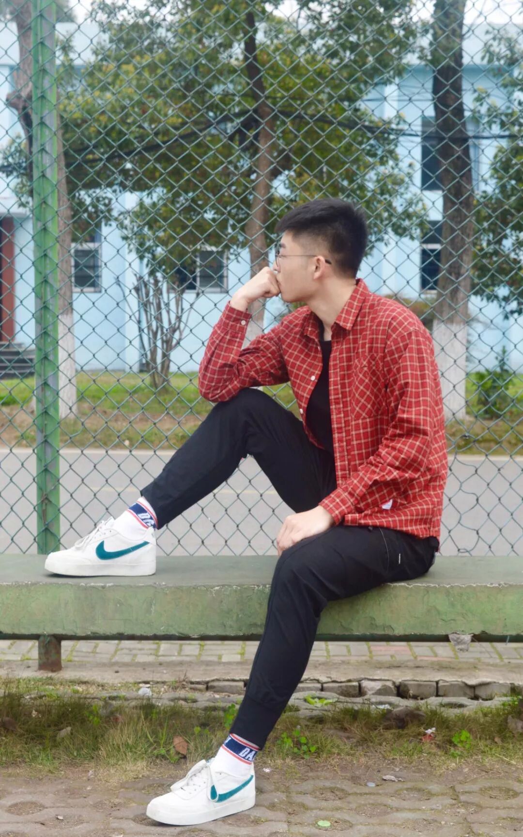 阳光正好,微风不燥的季节适合踏春,适合小憩。黑框眼镜,红白条纹格子衬衫内搭黑色T恤,黑色修身小腿裤再加之白色板鞋和休闲双肩背包,清新舒畅的感觉是给人的第一印象。可曾记得足球场和林荫道旁的石梯,装满了我们的青春幻想。抬起头,那一缕阳光,正好朝我跑来,有关春日的记忆定格在那一年的胶卷里。
