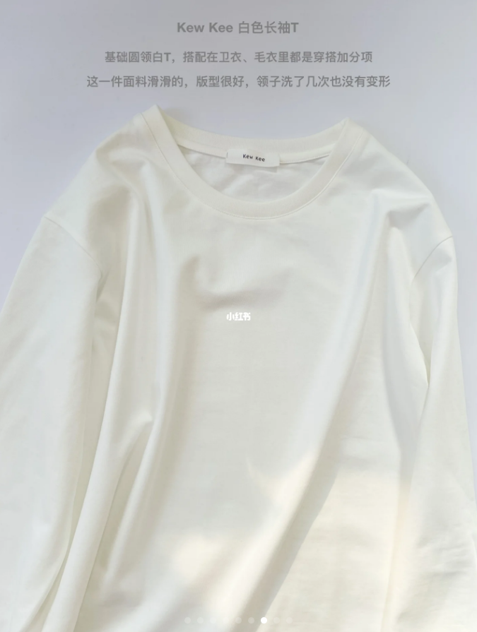 黑白灰蓝和米色是我早春/冬春(秋冬)胶囊衣橱里必不可少的基础色系今天分享的8件单品都是个人觉得百搭实用能穿好几年的经典款构建胶囊衣橱离不开以下几类:打底衫、卫衣、毛衣衬衫、白T、背心外套、裤子、半裙这几大类里面又能细分出很多种类本文分享的这几件都是我觉得在这些大类里面比较基础的款大家想要发展可持续衣橱尽量不要选择设计感太强或者过于花里胡哨的单品比如第一件的白T,和第二件灰色卫衣就是日常生活中最常用的几乎搭配什么都可以(一)Kew Kee 白色长袖T恤