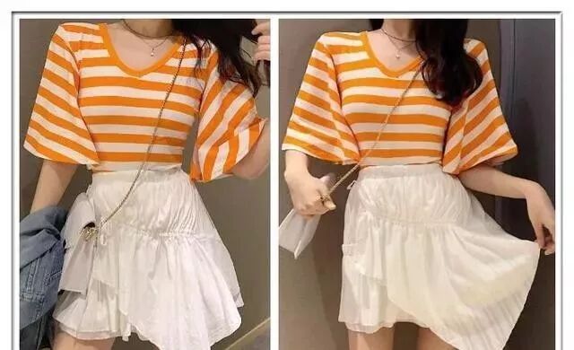 条纹短袖是性感的V领设计,修饰了出纤细的天鹅颈,和塑造出V脸的即视感,黄白色拼色条纹元素丰富了视觉冲击感,让这个夏季充满了青春的味道,它的亮点在于它的袖子,喇叭袖设计修饰了手部的线条,将手臂的赘肉藏起来,它的袖子巧妙地转移了肩宽的问题,下半身搭配白色的不规则半身裙,不规则的设计元素,拉长了腿部的线条,立马呈现出大长腿的即视感,宽肩女生们夏季的时候这样搭配,青春美少女这个美称就是形容你本人啦。