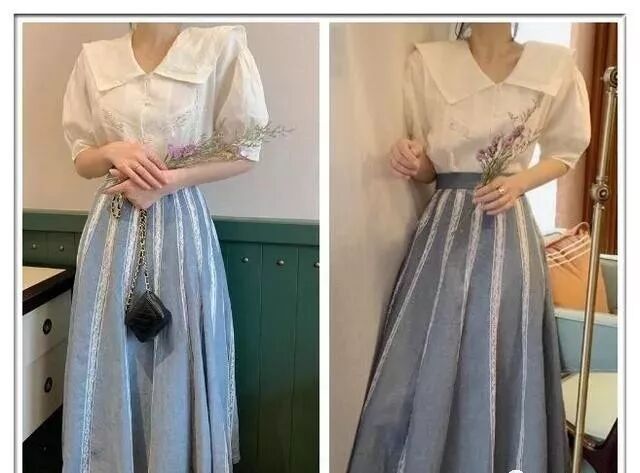 翻领上衣同样也是宽肩女生的首选服装,因为翻领设计将肩膀的缺点转化成优点,肩膀宽更能撑起翻领上衣,看起来来更加有美观和时尚感,将白色的翻领束进小清新风的高腰半身裙里,立马呈现出田园女孩的即视感,而且还是一个身材超级好的田园女孩,将翻领上衣的衬托下,勾勒出盈盈一握的小蛮腰,让人心动不已,这样穿你也能变成纤细女人肩。