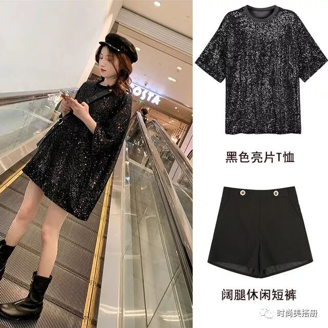 这款穿搭整体效果很显瘦,肩宽的女生应该多穿一穿黑色,因为黑色会弱化肩线,显得更瘦小,上衣是一款亮片T恤,个性又时尚,宽松的版型,中长款的设计,小个子也能驾驭,搭配一条黑色阔腿短裤,尽显活力少女气息。