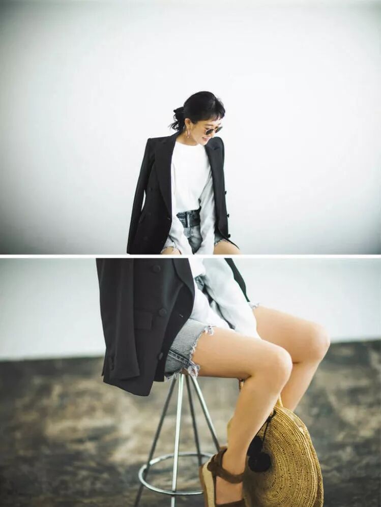 A:尝试一些诸如upperhights等成熟风品牌的短款下装。这件牛仔短裤不会太短,也不会太紧,十分的修身舒适。不愧是属于成熟女性的品牌的产品。因为上装和下装都是休闲的款式,所以肩上披了一件夹克突出重点。
