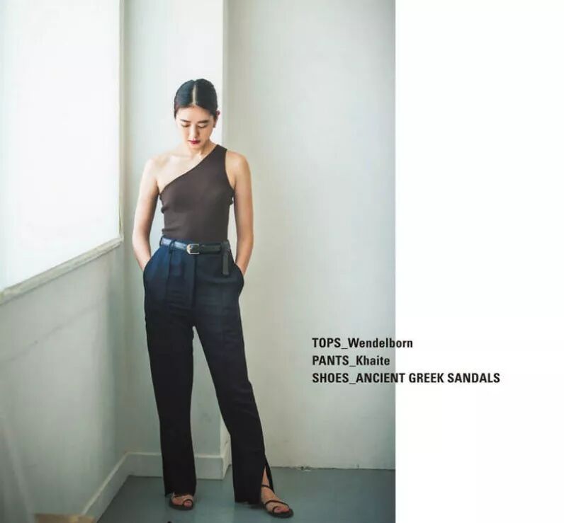 A:穿着时尚的单肩衫,毫不犹豫地露出肩膀。单肩针织衫这样简洁又时尚的单品是我的心头好。再搭配一双凉鞋营造慵懒之感。