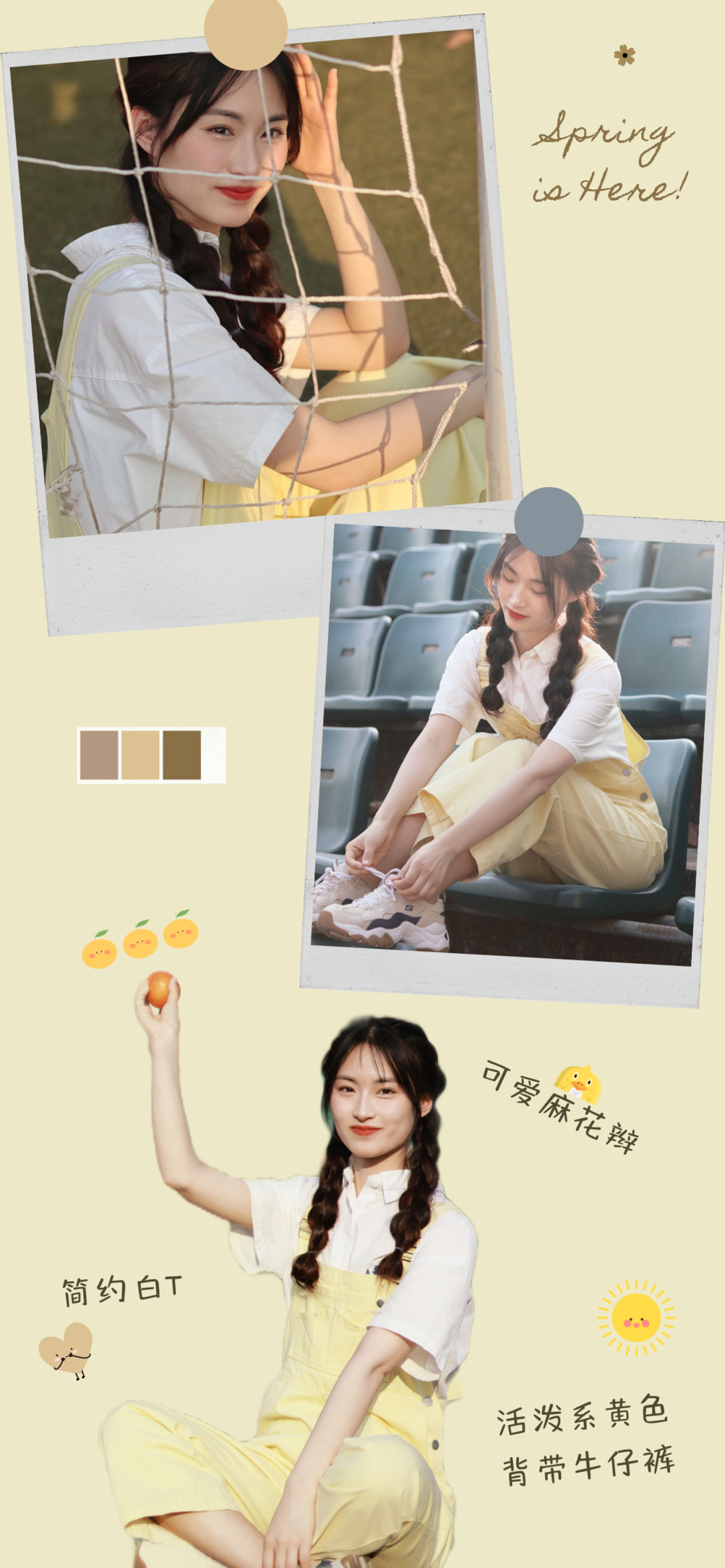 简约白T、活泼系黄色背带牛仔裤