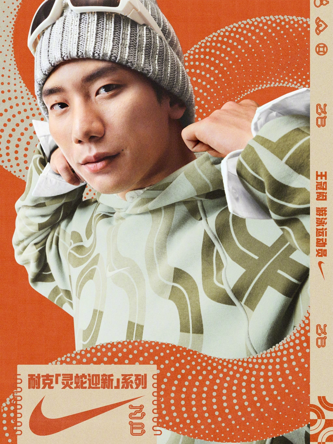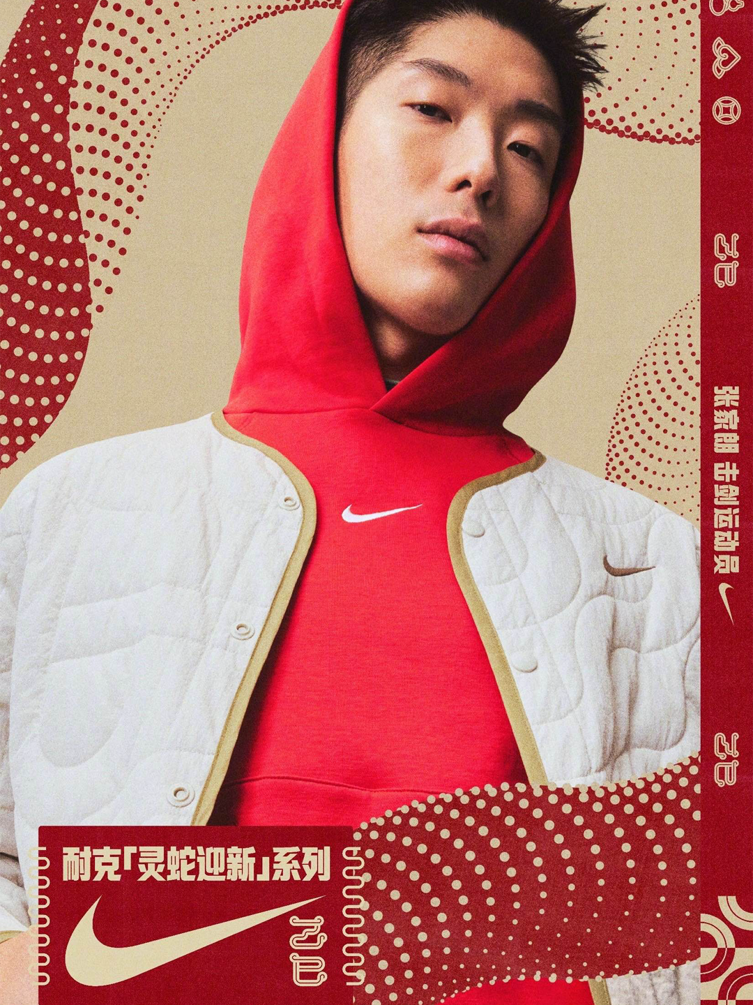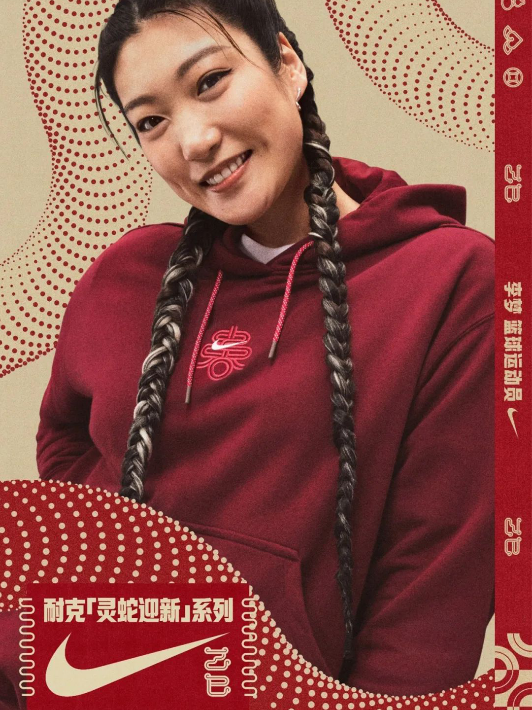 耐克特别邀请运动员演绎新春造型:网球运动员郑钦文穿着「灵蛇迎新」拼接毛皮外套搭配女款 Nike Dunk Low,新年特制鞋带与金属扣细节焕发活力;击剑运动员张家朗选择玉石系配色绗缝棉服夹克,内搭正红连帽衫展现新中式质感;跑步运动员葛曼棋与 Uzi 则脚踩 Nike Pegasus 41,融入红色花纹及灵动蛇纹反光设计,步履间传递新春吉运。