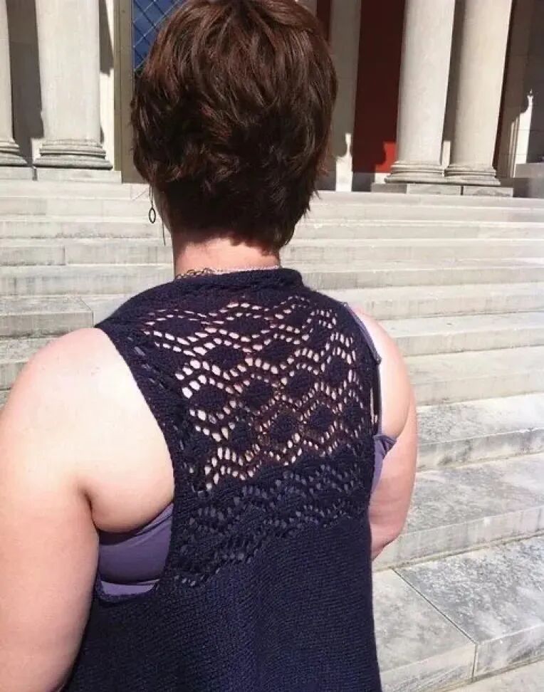 例如上图中后背脂肪偏多,肩线不够明显、手臂偏粗,选择衣服的时候则应该选择可以覆盖后背与手臂并塑造肩部线条的款式,要对后背、手臂及肩部起到遮掩加修饰的作用。如下图: