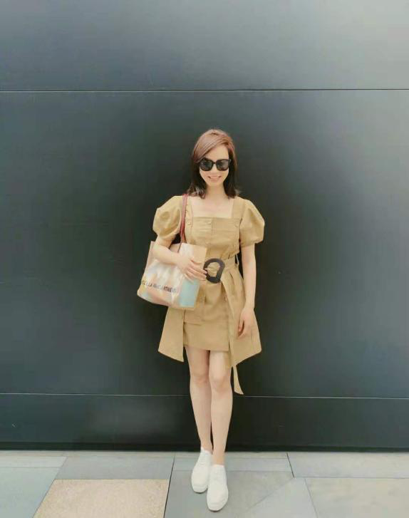 今年非常流行泡泡袖设计的服装,陈数这件卡其色泡泡袖连衣裙具有极好的减龄效果,裙子的长度在膝盖以上,露出纤细的双腿更加显瘦。